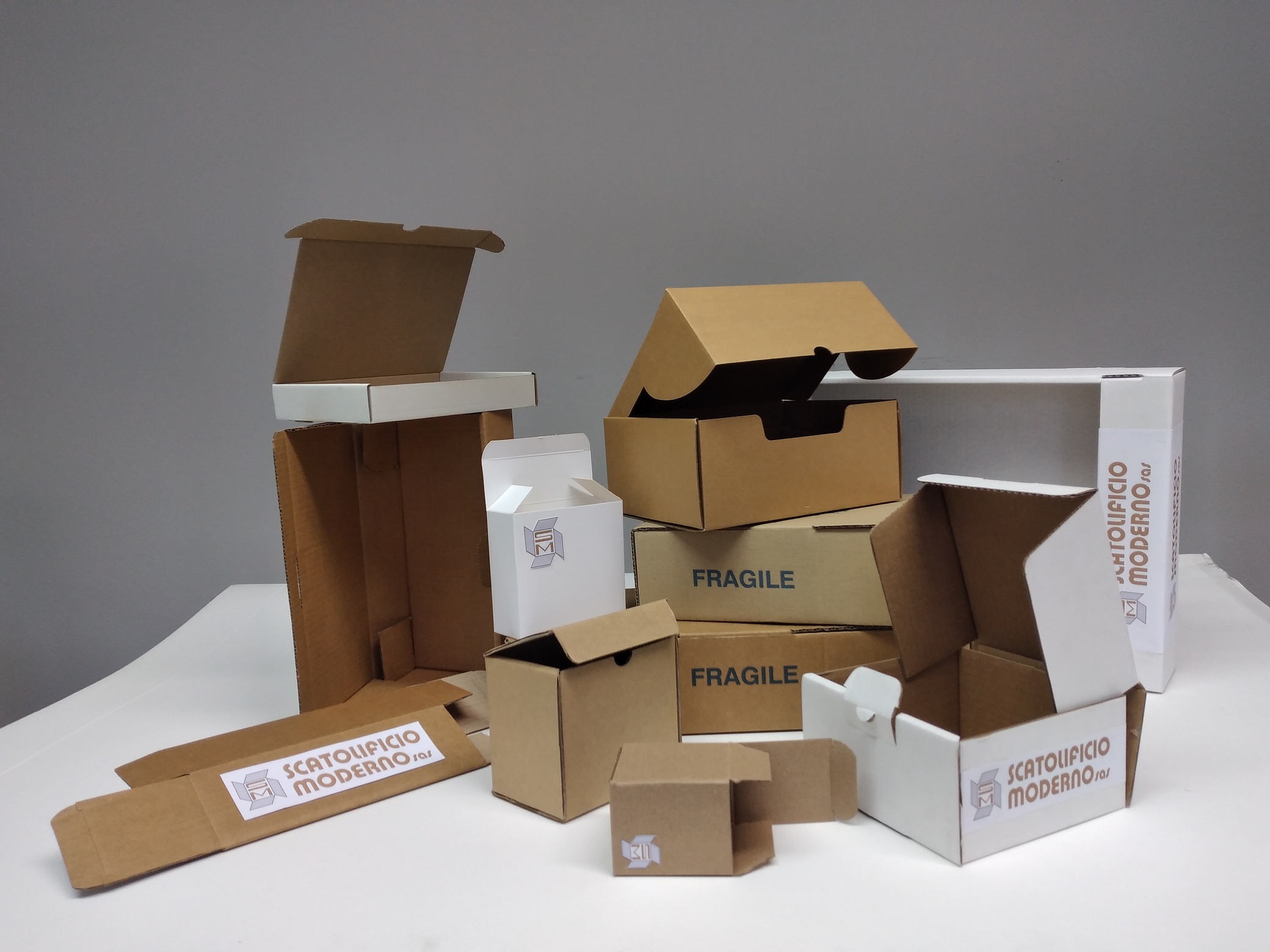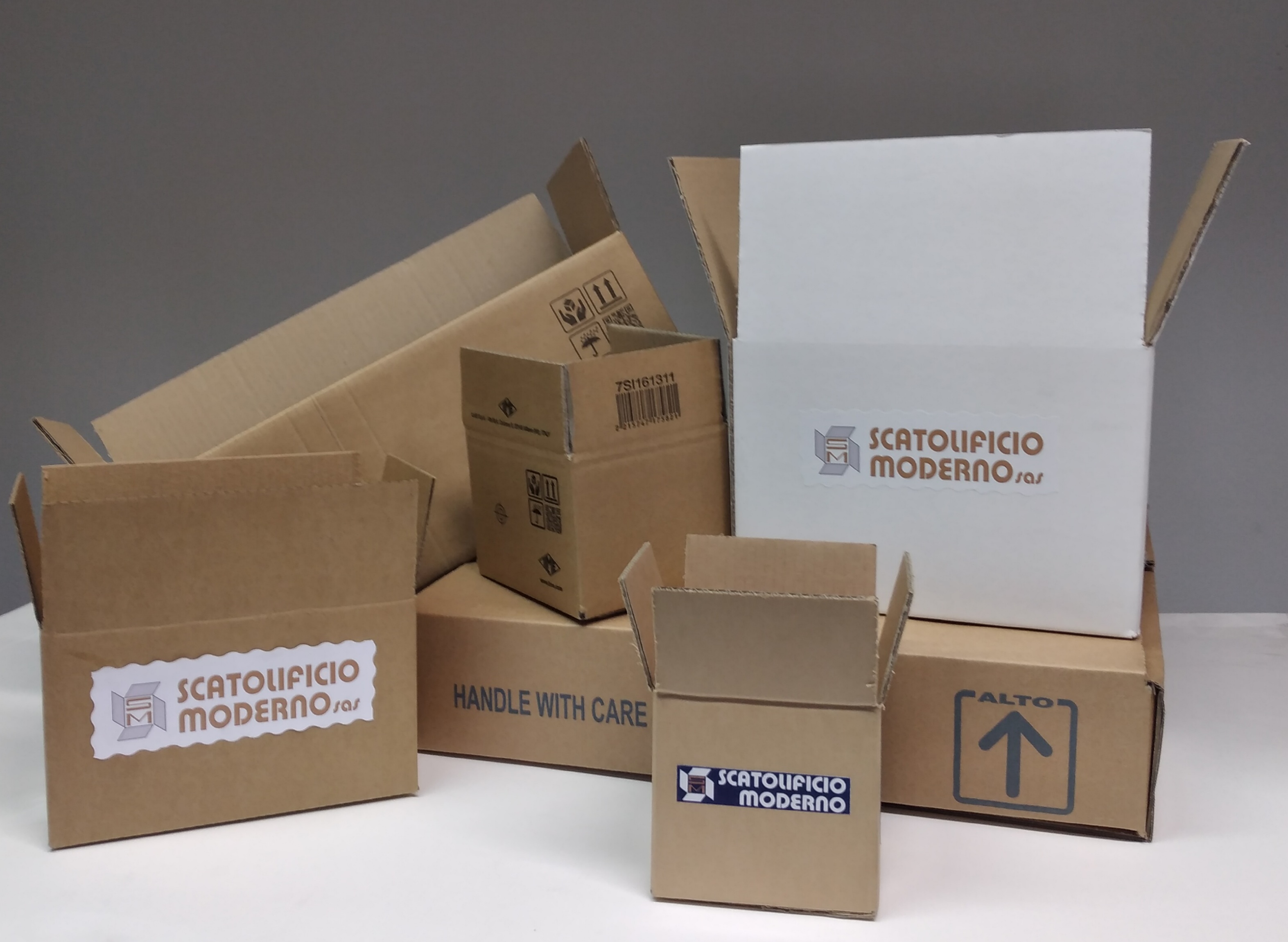 La tecnica di produzione richiede l’uso di un impianto fustella che consente di effettuare, con precisione, tagli e pieghe grazie ai quali comporre la scatola. Possiamo fornirle con cartone avana o bianco ad un’onda, due onde o cartoncino teso.